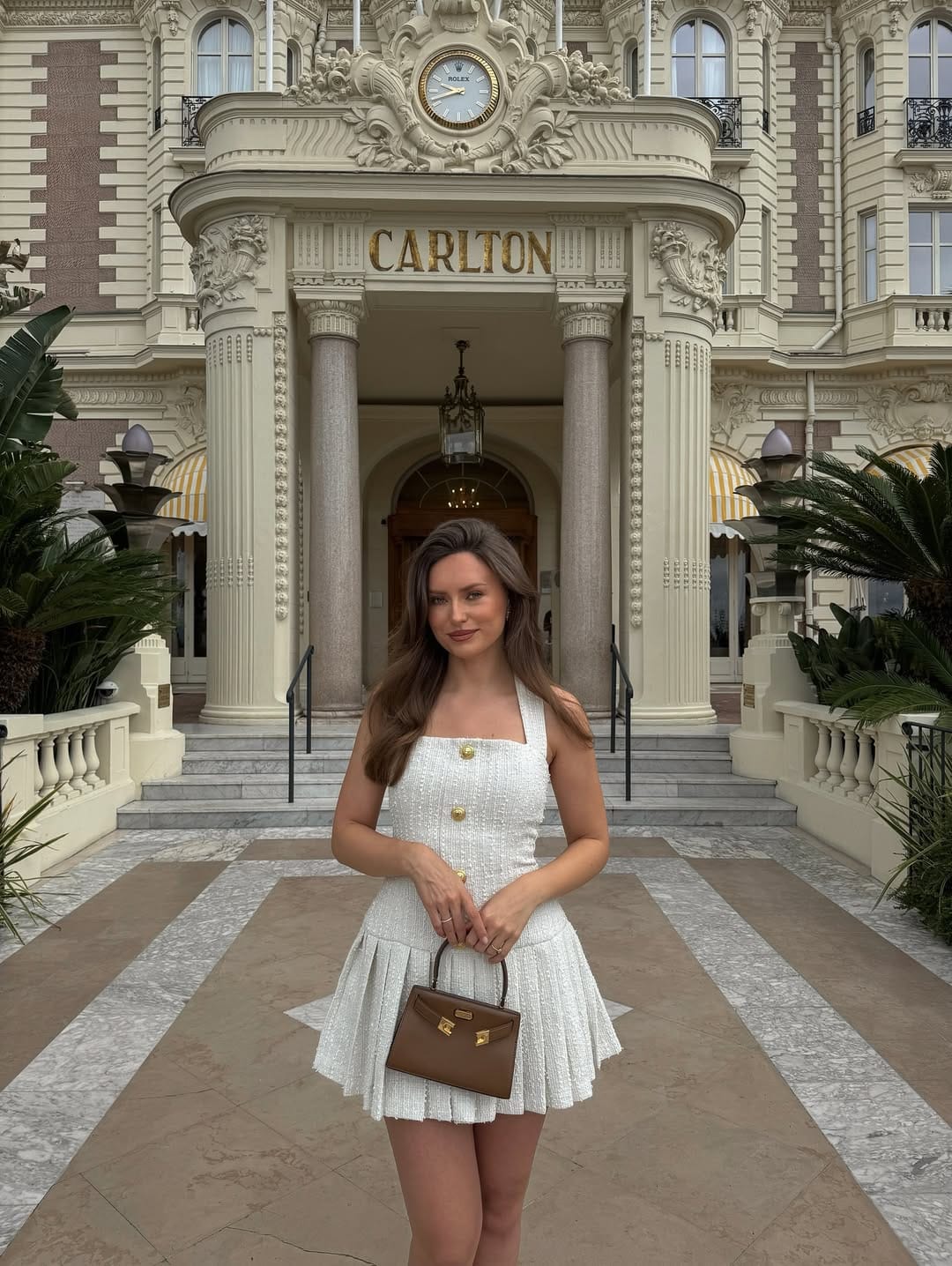 @ livia_auerShe’s serving fresh summer romance in a creamy white textured tube mini dress with playful buttons and a flirty skirt that twirls just right. Layered necklaces and a classic brown mini bag amp up the polished yet fun date night charm.