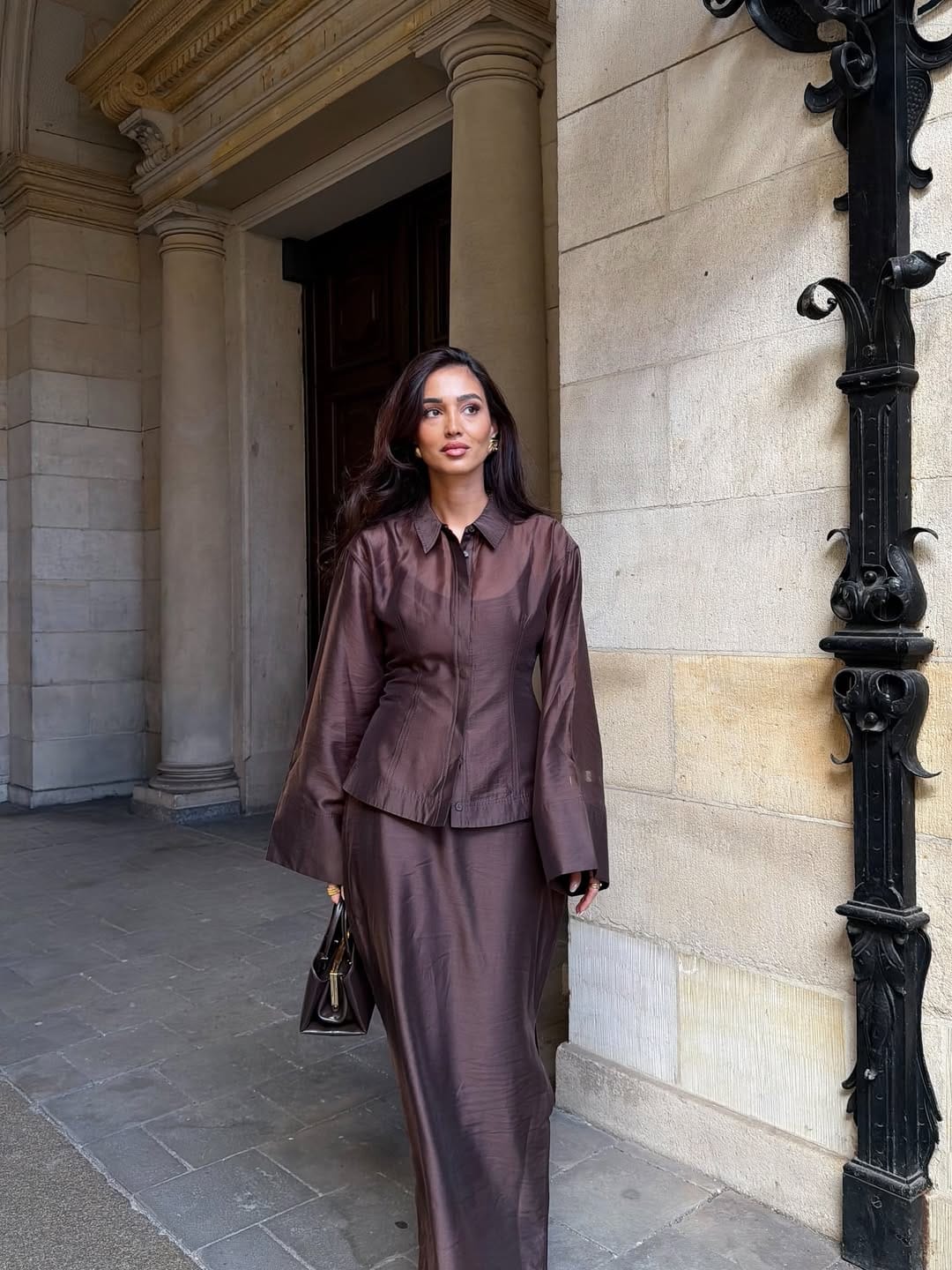 @ samira.sfiiiShe’s dripping in drama with this sheer plum-toned long-sleeve button-up top and matching flowing maxi skirt, all silky and sophisticated. A gold bracelet and structured brown bag seal the deal for your most enchanting date night yet.