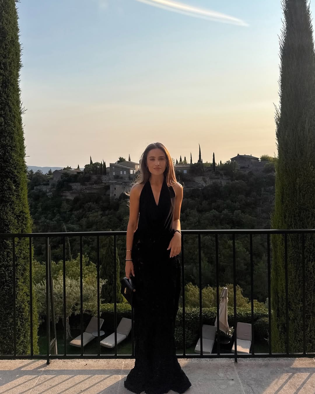 @ heloise.guilletShe’s slaying in a luxurious black velvet off-shoulder gown with a fitted bodice and flowing floor-length skirt, pure red-carpet romance. The vibe is complete with drop earrings and a chic black clutch for that sophisticated date night sparkle.