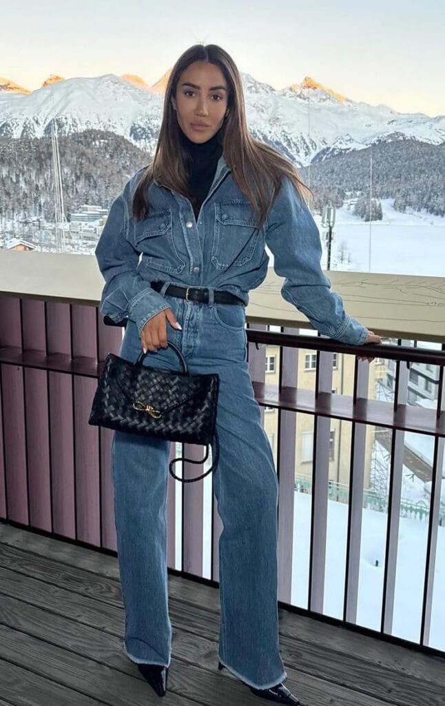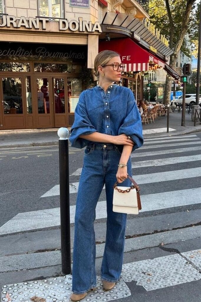 Giving off major Parisian vibes, she rocks a voluminous puff-sleeve denim shirt paired with matching flared jeans. Tan pointed boots and a structured cream mini bag pull everything together effortlessly.