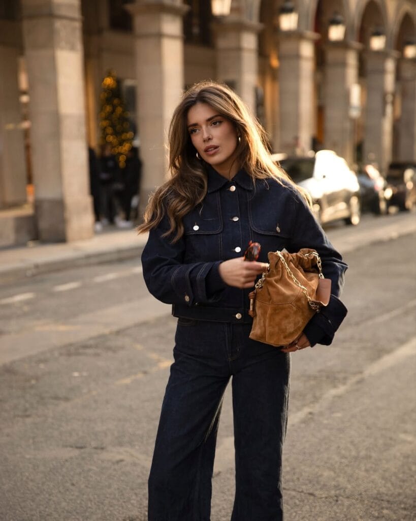 @ heloise.guilletThis city stroll look pairs a dark indigo denim jacket with wide-leg jeans in the same rich shade. Her casual-cool vibe is boosted with a camel suede bucket bag and golden ring details.