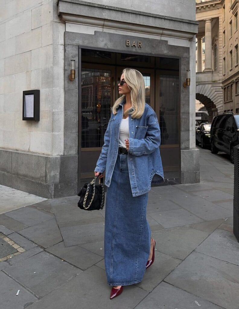4. Modern Muse Oversized Light Denim Shirt and Maxi Skirt