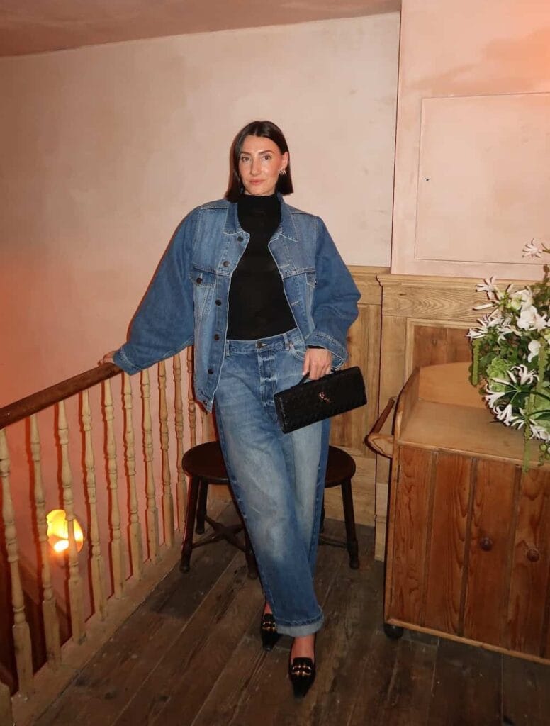 @ sarahlouiseblytheThis look mixes a relaxed light blue denim jacket and faded straight jeans, layered over a black turtleneck for a sleek, retro vibe. Gold hoop earrings and embellished black pumps elevate the whole ensemble.