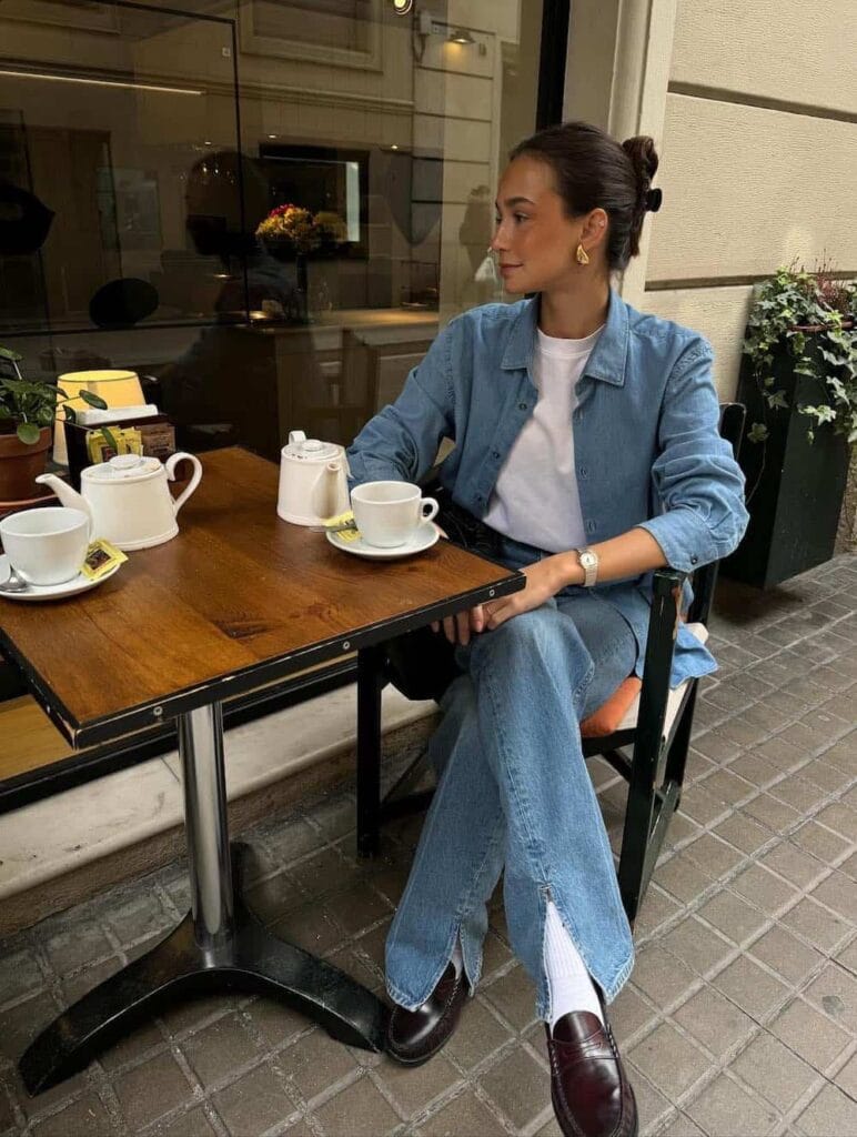 @ blancaarimanyLounging at a cafƩ, she pairs a light blue denim shirt over a classic white tee with split-hem flared jeans. The preppy touch of socks with loafers and gold hoop earrings gives just the right amount of polish.