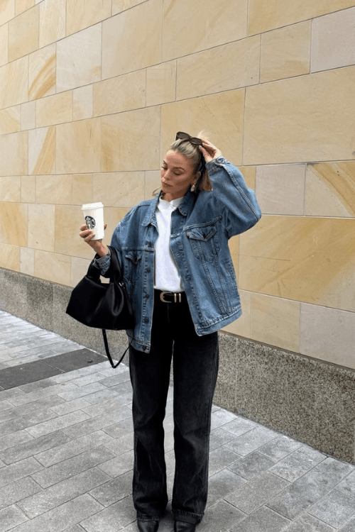 @ robynhenderson__She styles an oversized light blue denim jacket with crisp black straight-leg jeans and a white tee for that staple cool-girl vibe. A black leather belt and oversized tote keep things functional and effortlessly city-ready.