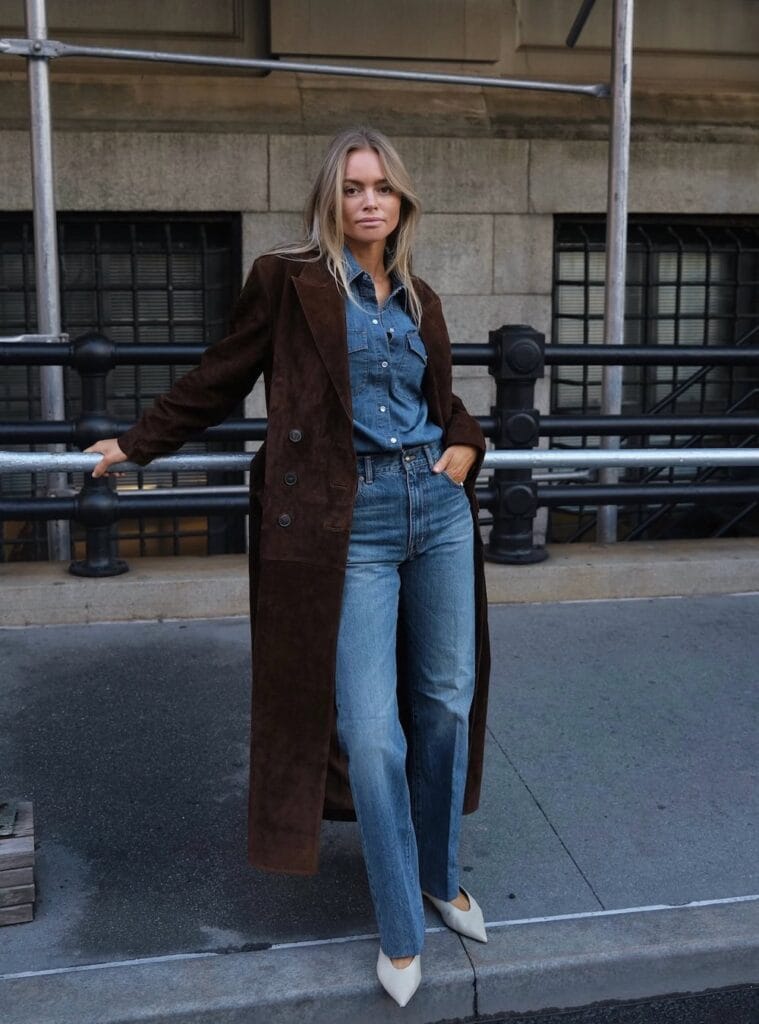 @ claireroseSheās keeping things refined in a classic blue denim shirt tucked into straight-leg jeans, made warmer by a luxe chocolate brown maxi coat. Soft pointed white heels bring an elegant finish to this city look.