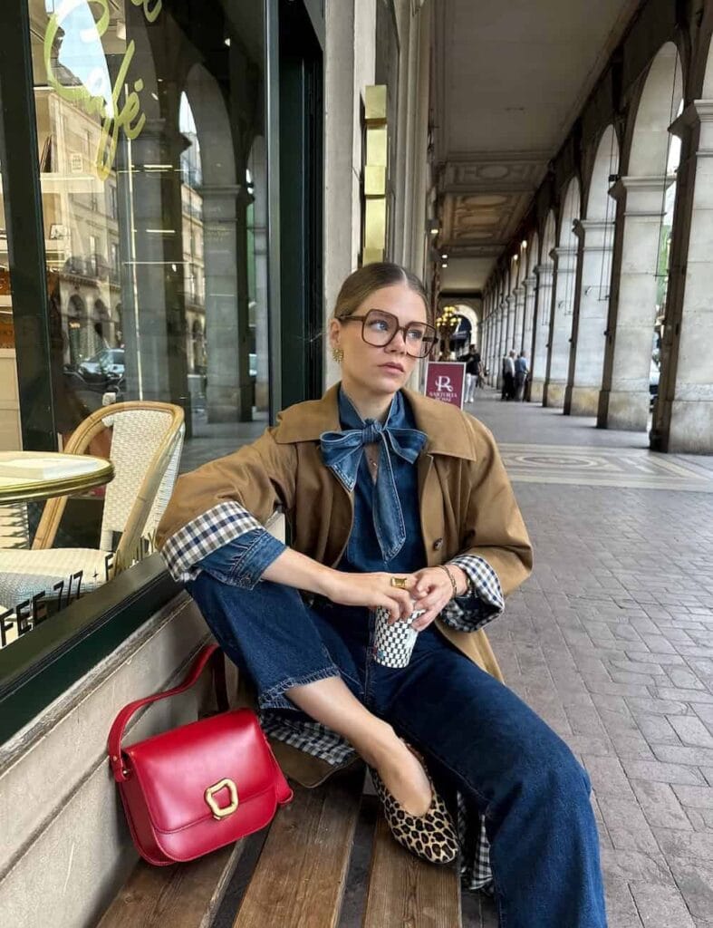 @ elodieromyServing major cafƩ chic, she styles a deep blue denim shirt with wide-leg jeans under a tan trench coat featuring checked lining. The oversized denim bow and leopard flats add quirky, playful flair.