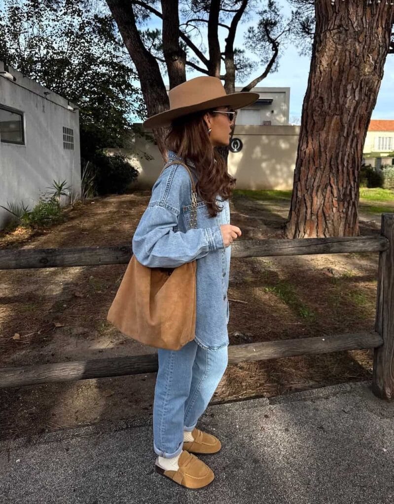 Sheās rocking a light wash denim shirt layered over matching slim-fit jeans for an easygoing, outdoorsy vibe. Tan loafers, a wide-brim hat, and a suede shoulder tote make this the ultimate laid-back autumn stroll look.