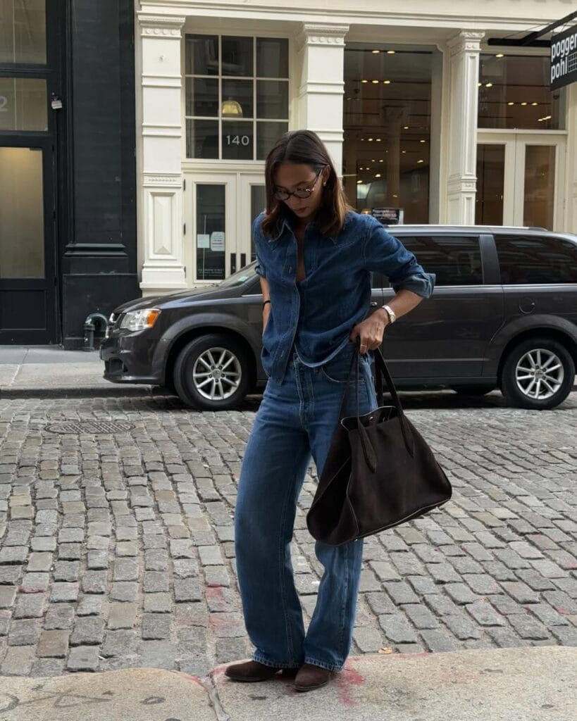 @ blancaarimanySheās keeping things cool and minimal with a fitted deep blue denim shirt tucked into wide-leg jeans. Sleek brown loafers and an oversized tote elevate this all-blue city stroll look.