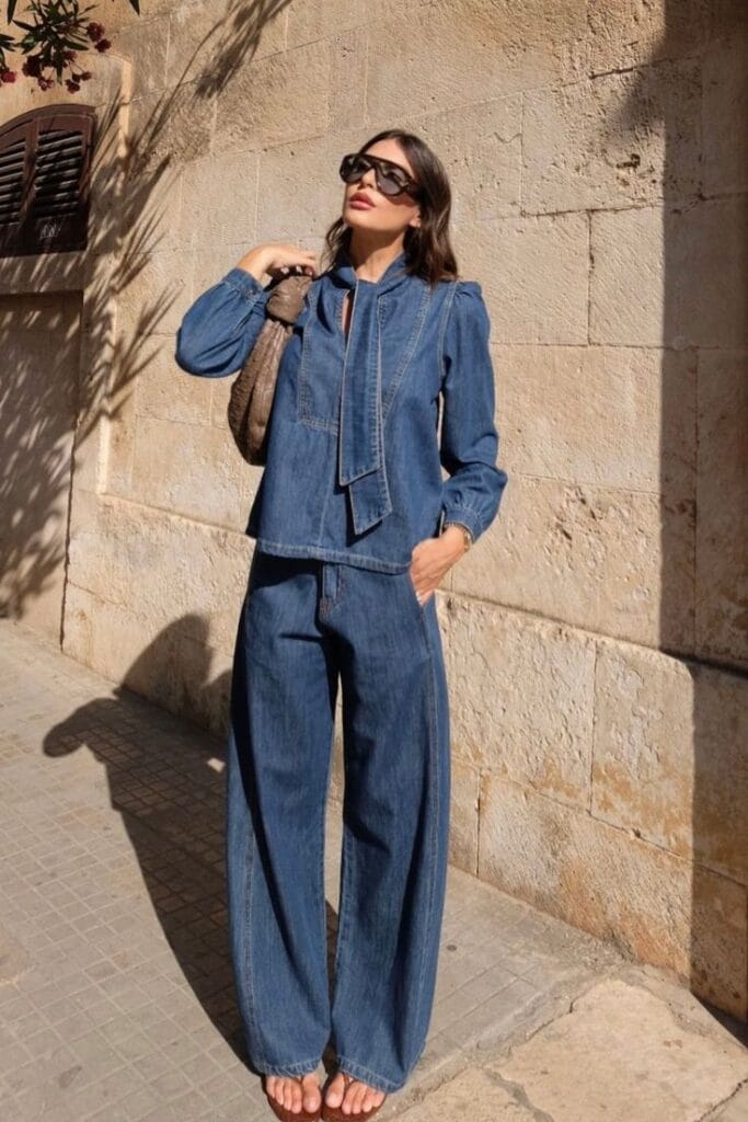 21. Laid-Back Statement Tie-Neck Denim Top and Wide-Leg Jeans