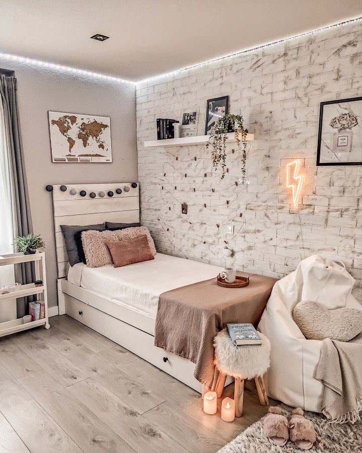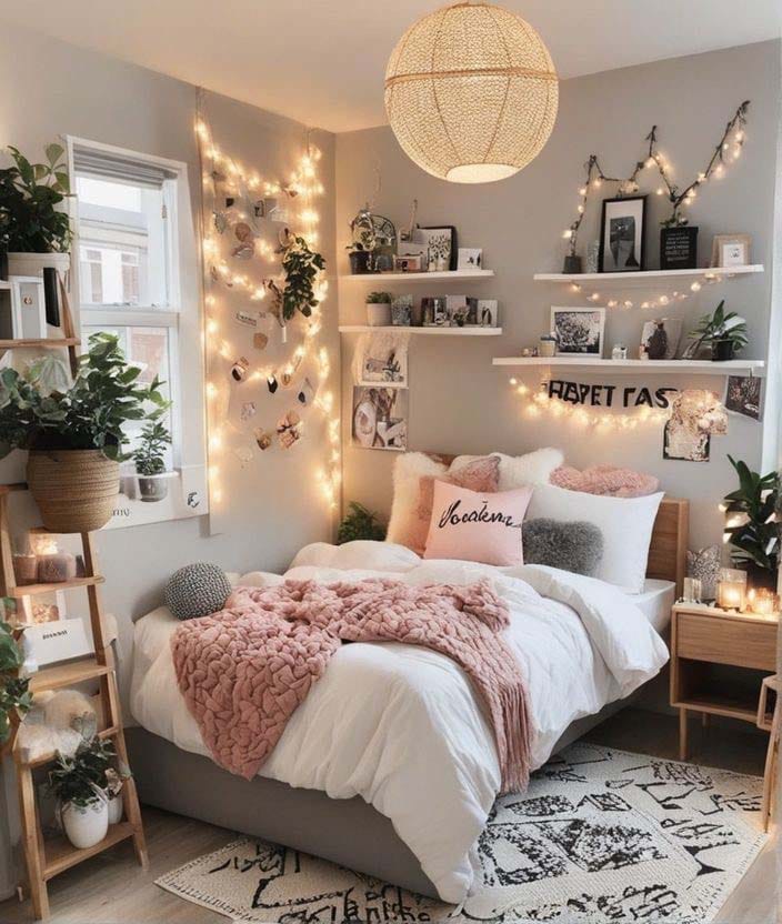 Think fairy lights, fluffy rugs, and colorful wall art.