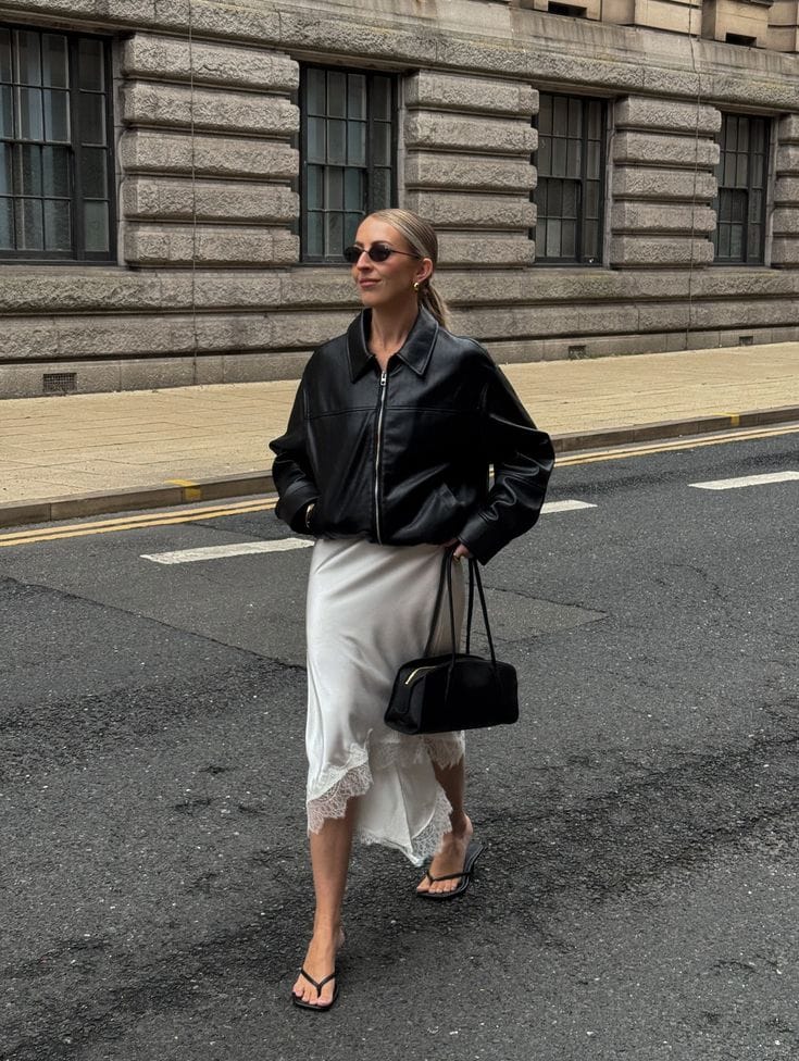 What I love about this look is how the structured leather holds the outfit together while the delicate slip skirt keeps it from feeling heavy for the season.