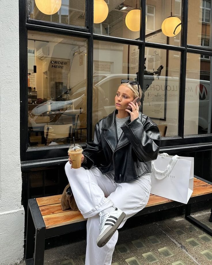 I love this combination because it’s the perfect casual-cool early spring formula — an oversized black biker jacket over a grey crewneck feels edgy but the white wide-leg denim keeps it clean and wearable.