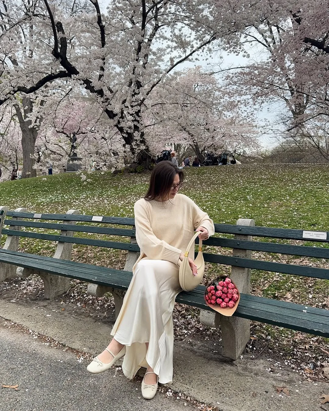 EI love this combination so much — there is something genuinely luxurious about a plush cream crewneck sweater with a lustrous cream satin maxi skirt that makes this feel like quiet old-money dressing at its finest.