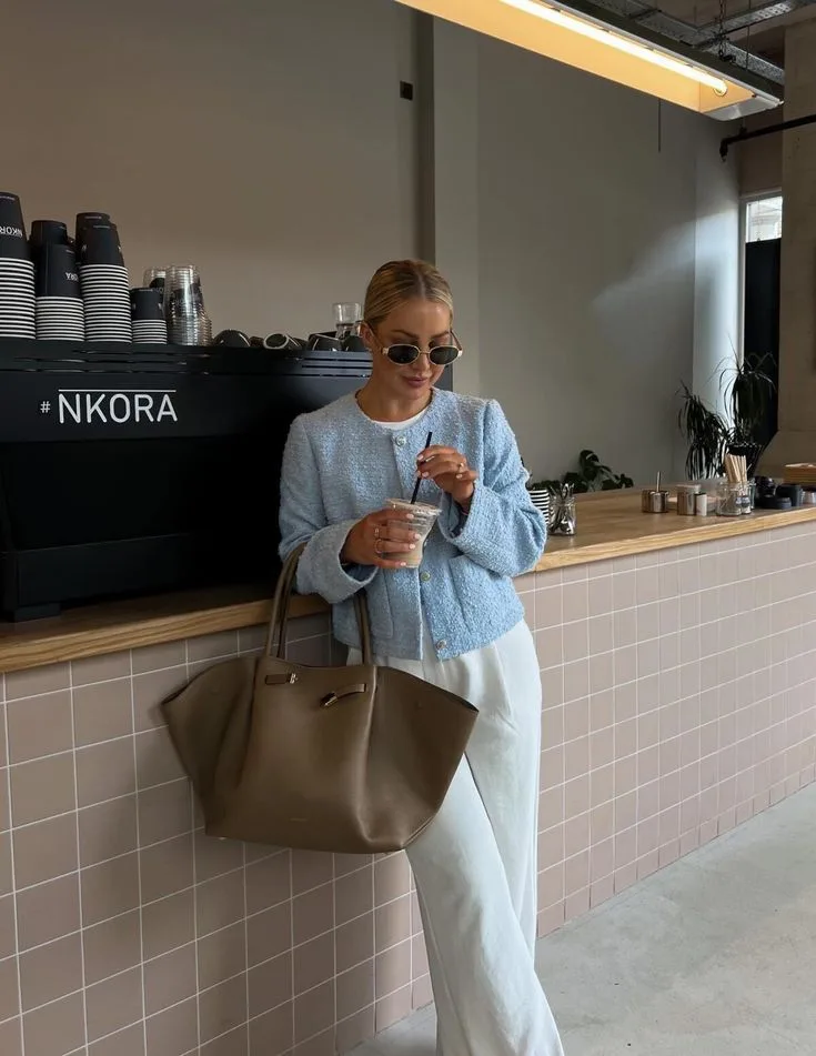 I love the freshness of this look — a cropped light blue bouclĆ© jacket with gold button detailing over a white tee and white wide-leg trousers is a spring outfit that feels both polished and genuinely happy.