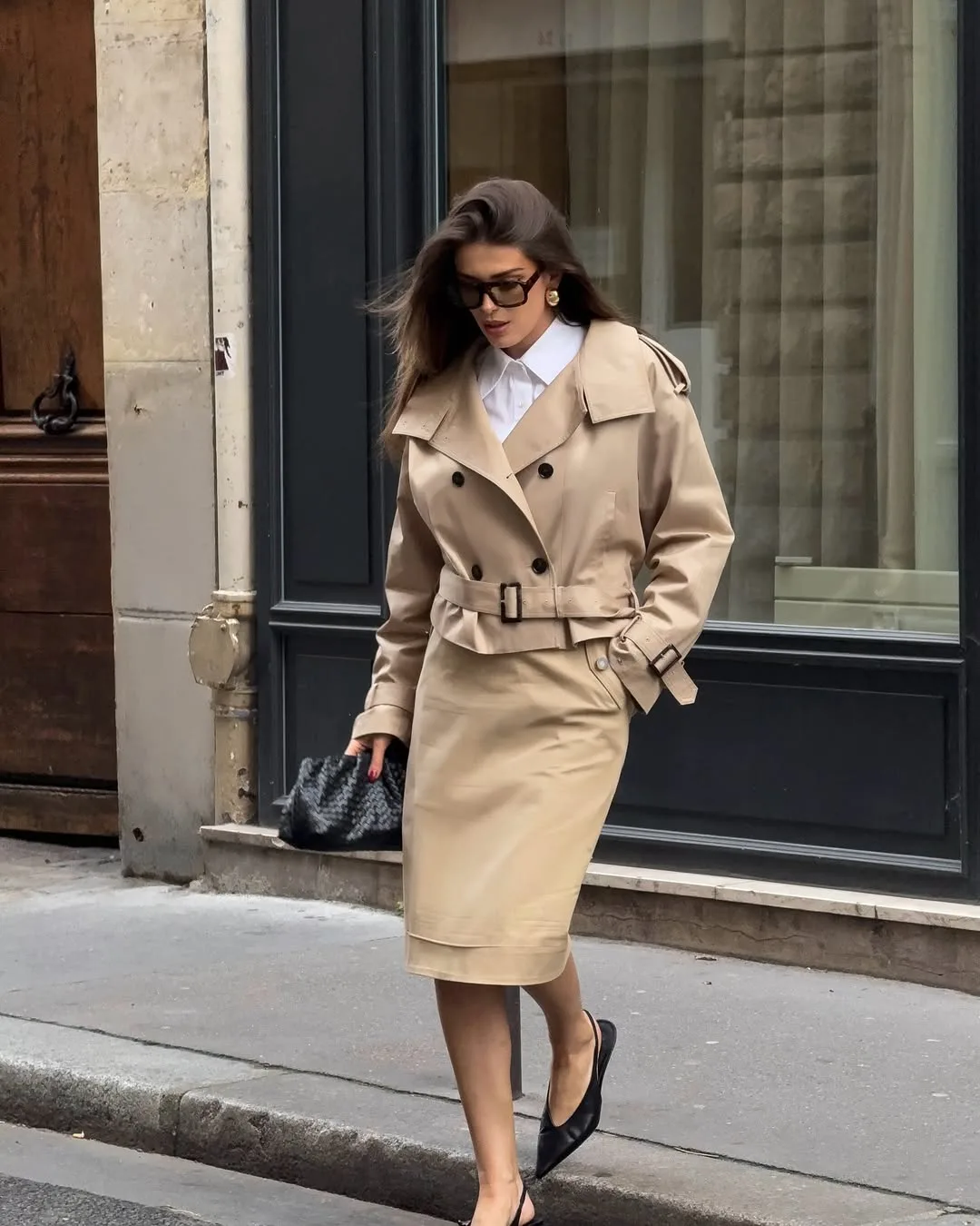 I’m obsessed with this beige trench co-ord — a double-breasted cropped trench jacket paired with a matching pencil skirt is a modern, sophisticated take on the classic trench silhouette that I find completely irresistible.