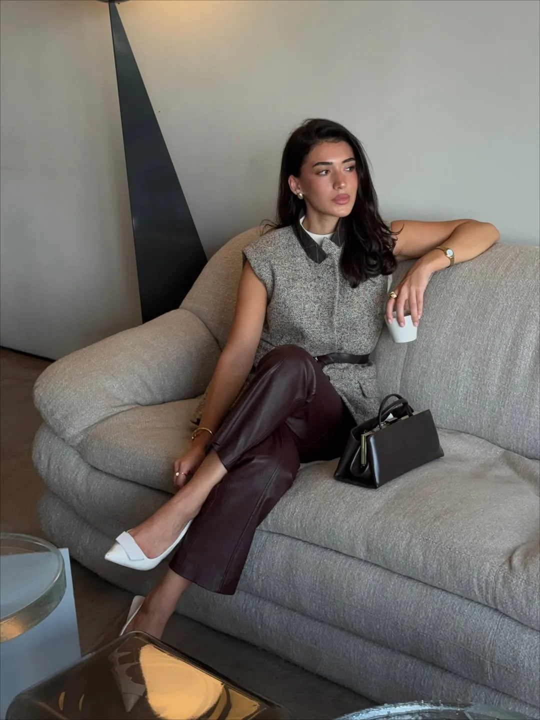 I’m obsessed with this unexpected combination — a structured grey herringbone knit vest with a dark contrast collar over a white mock-neck top is already interesting, but the burgundy leather straight-leg trousers take it somewhere genuinely extraordinary.