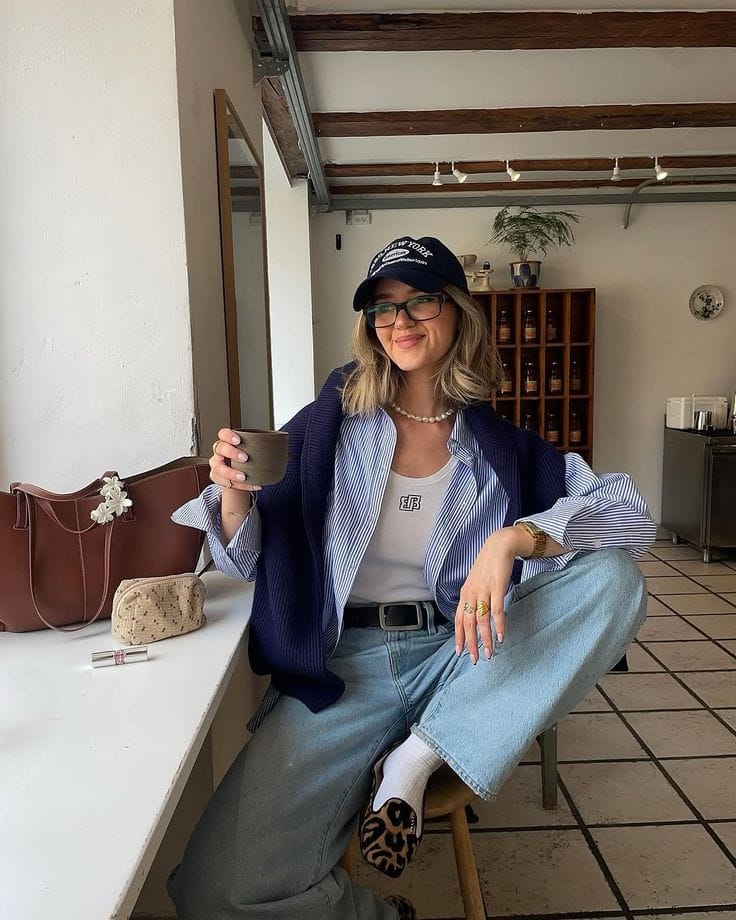 I’m obsessed with how this outfit layers — an oversized blue-and-white striped shirt over a white graphic tank with a navy ribbed cardigan draped over the shoulders and light-wash relaxed jeans is early spring layering at its most effortless.
