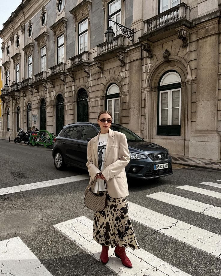 4. Relaxed Beige Blazer over Graphic Tee with Printed Midi Skirt