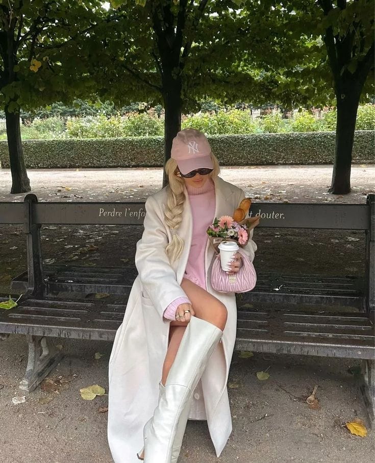 This is my favourite layering formula for early spring — a soft pastel knit tucked under a long cream coat creates a look that feels both cosy and genuinely elegant.