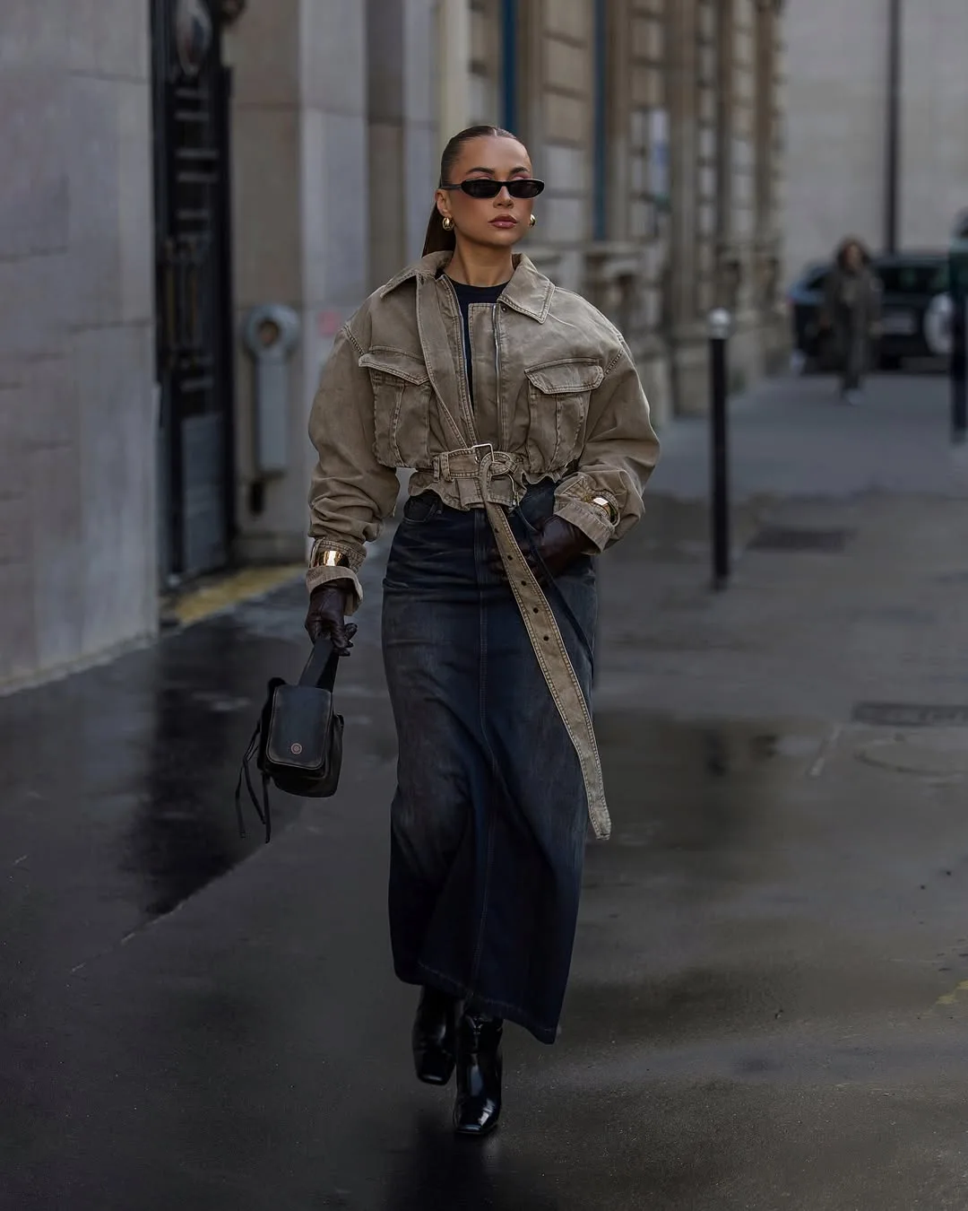 What I love about this look is the military-inspired energy — a cropped, belted olive utility jacket paired with a charcoal denim maxi skirt creates a silhouette that feels strong, modern, and completely fresh for spring.