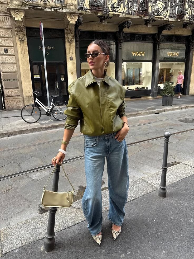 9. Olive Green Faux Leather Bomber with Wide-Leg Light-Wash Jeans
