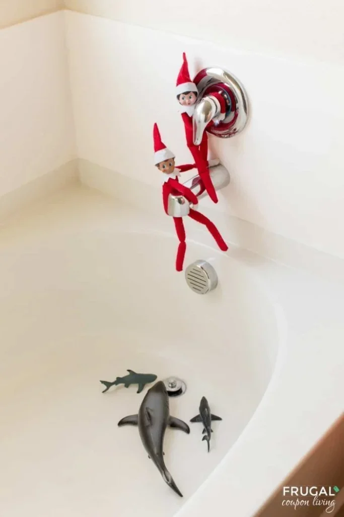 Set up a dramatic rescue scene with your elf floating in a “shark-infested” pool (a blue towel or bowl of water) and toy sharks circling around. Time for a Christmas hero!