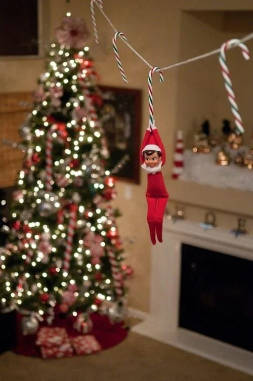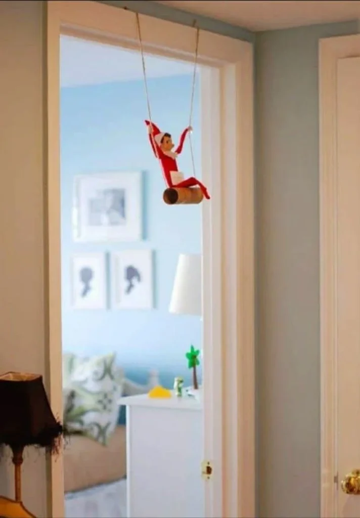 Turn your elf into a little daredevil by hanging them from the ceiling with string or ribbon. Itās like their own acrobatic Christmas circus!