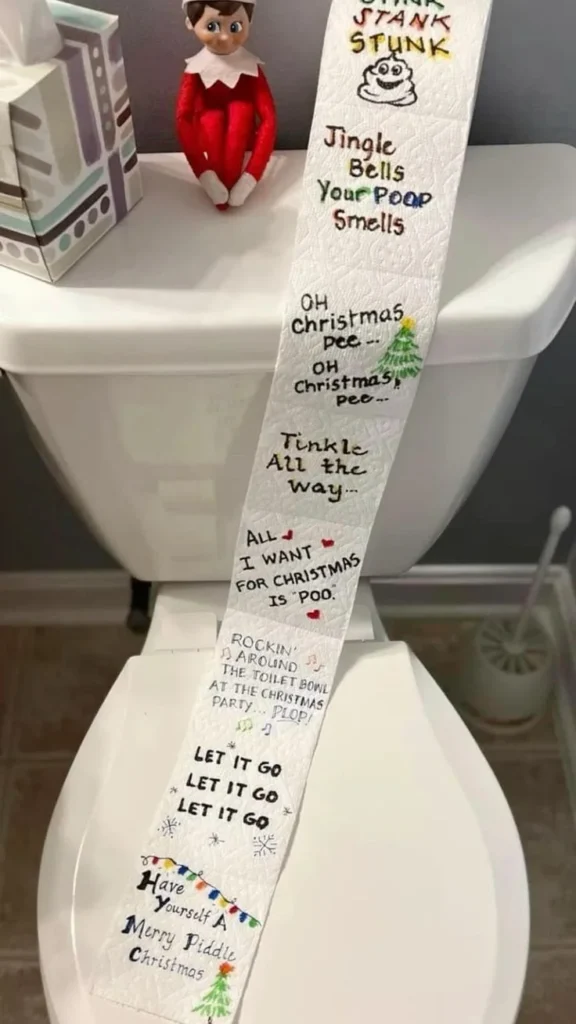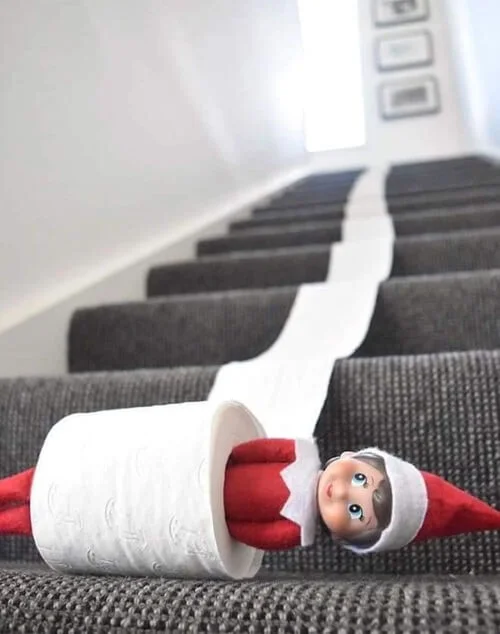 Have your elf rolling out of control in a toilet paper roll mess. Itās silly, harmless fun that kids will love discovering.