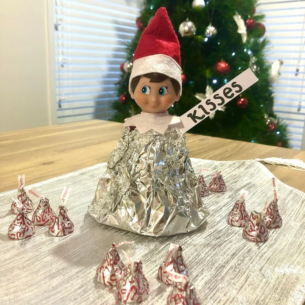 Set your elf up near a pile of Hersheyās Kisses with a note saying, āSending you kisses!ā Itās cute and sweet!