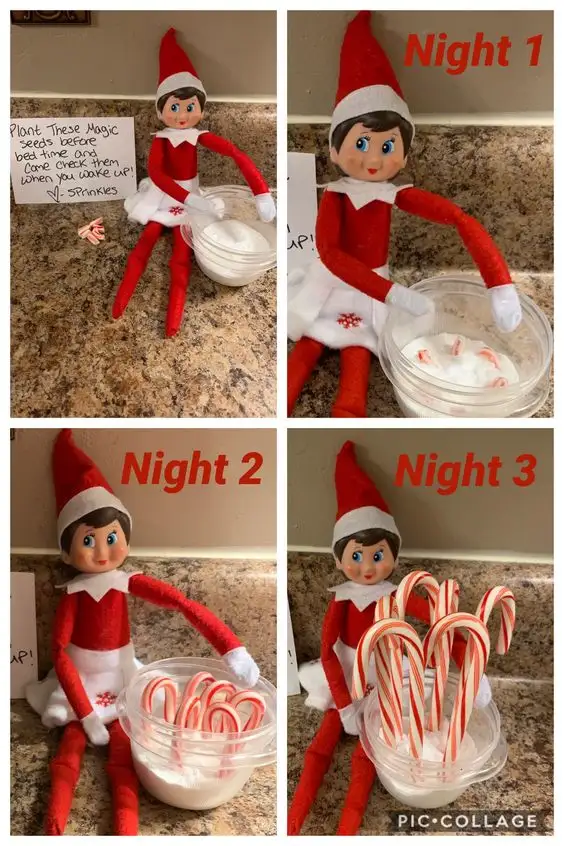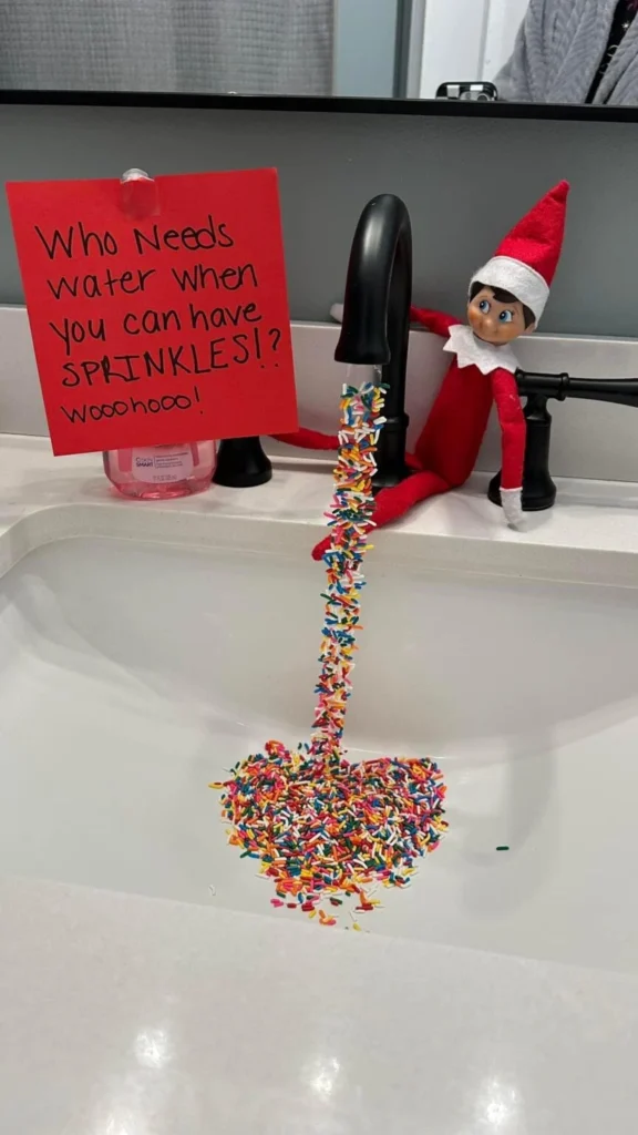 Tape a bag of sprinkles to your faucet and place your elf as if theyāve created a sprinkle āwaterfall.ā Messy but magical!
