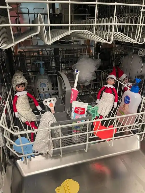 Give your elf a spa day by placing them in the dishwasher with a face mask (a cut-out paper) and cucumber slices (use paper circles). Self-care at its finest!