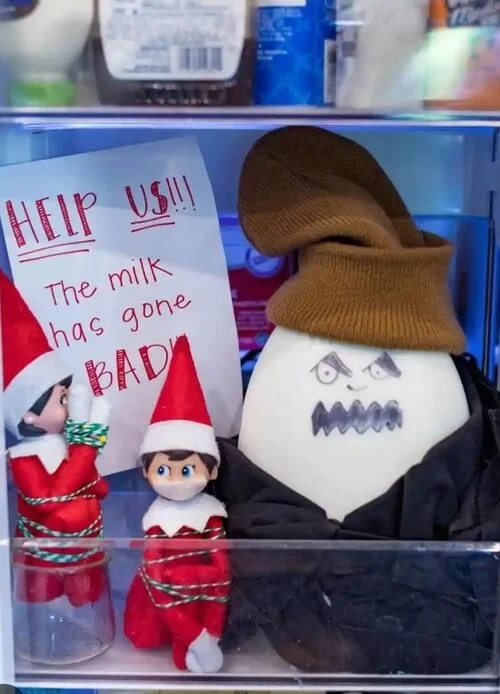 Stick googly eyes on the milk carton and place your elf nearby looking horrified. Add a sign saying, āHELP! The milk has gone bad!ā for a hilarious twist.