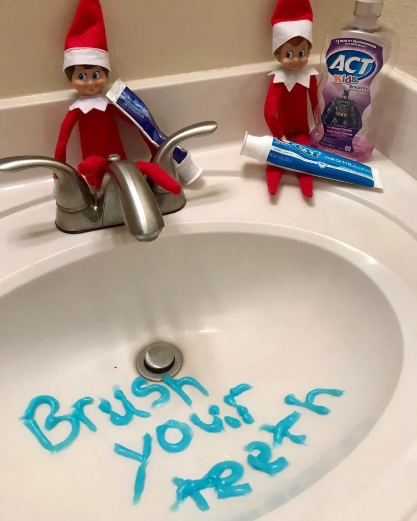 Set your elf up near the bathroom sink with a toothbrush and toothpaste, reminding everyone to keep those teeth sparklingāeven elves need good dental hygiene!