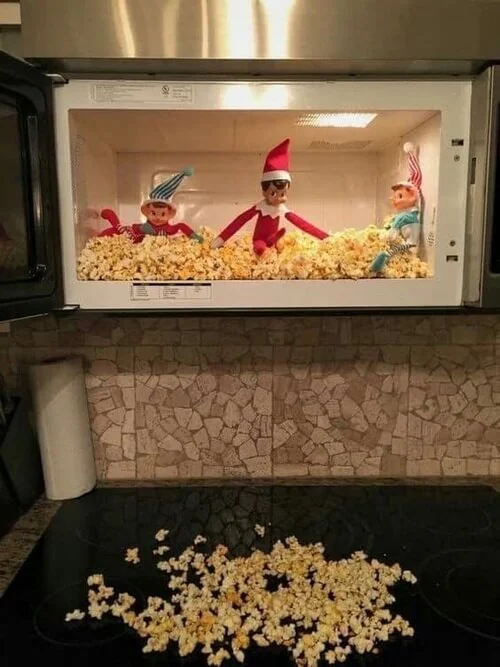 Scatter marshmallows or popcorn inside the microwave and have your elf sitting inside with a āWhoops!ā sign. Just donāt actually turn it on!