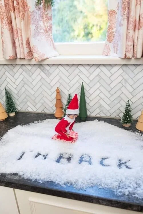 Position your elf with its behind covered in mini marshmallows or bubbles from soap foam. This cheeky setup is a crowd-pleaser for sure!