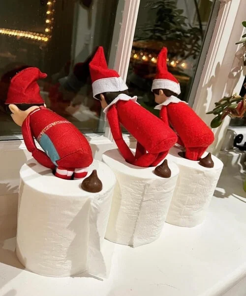 Scatter Hersheyās Drops or chocolate chips along a roll of toilet paper to create a ātrail.ā Place your elf at the end looking guilty!