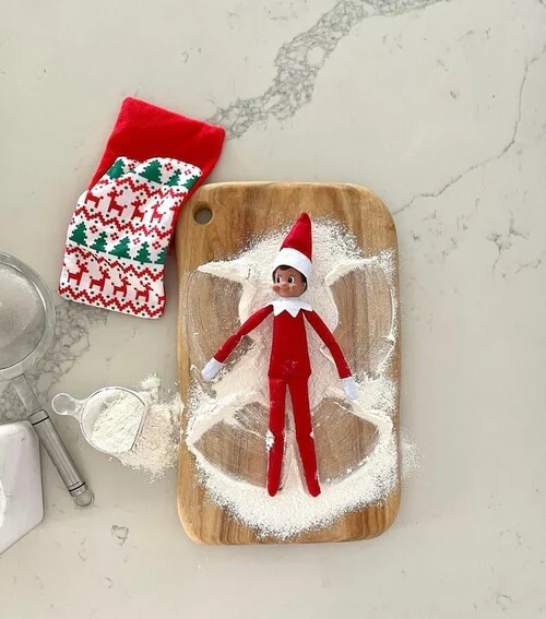 Spread flour or powdered sugar on the counter and lay your elf in the middle, creating snow angel impressions around them.