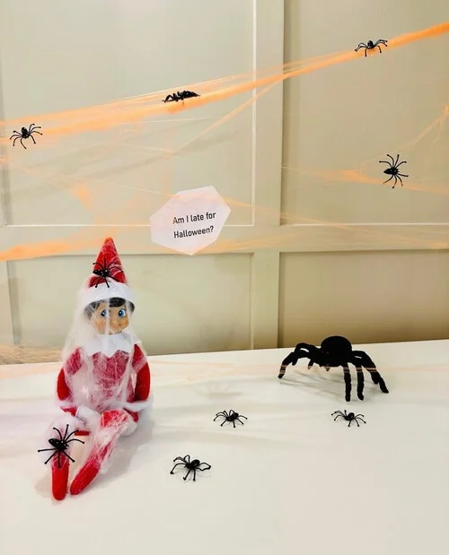 Trap your elf in a tangle of white string or fake spiderwebs for a spooky and silly twist.