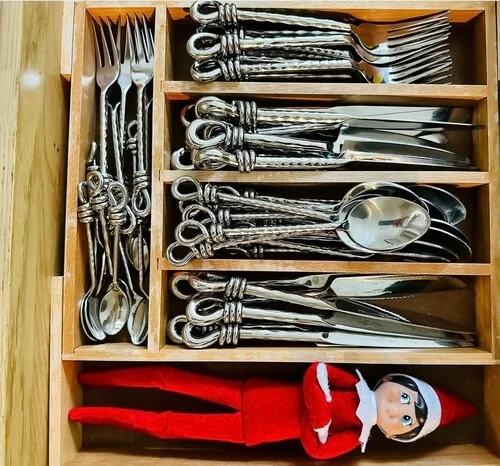 Tuck your elf into a drawer with the forks and spoons, like theyāre hiding out for a little holiday mischief.