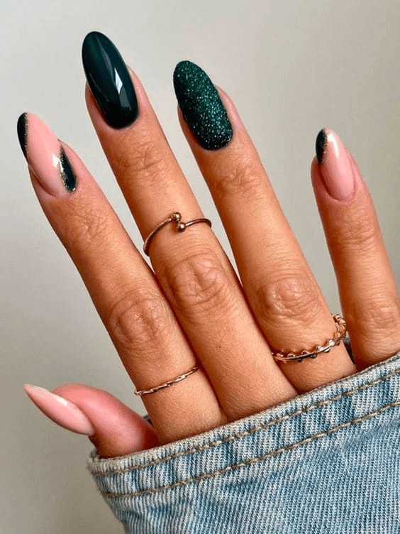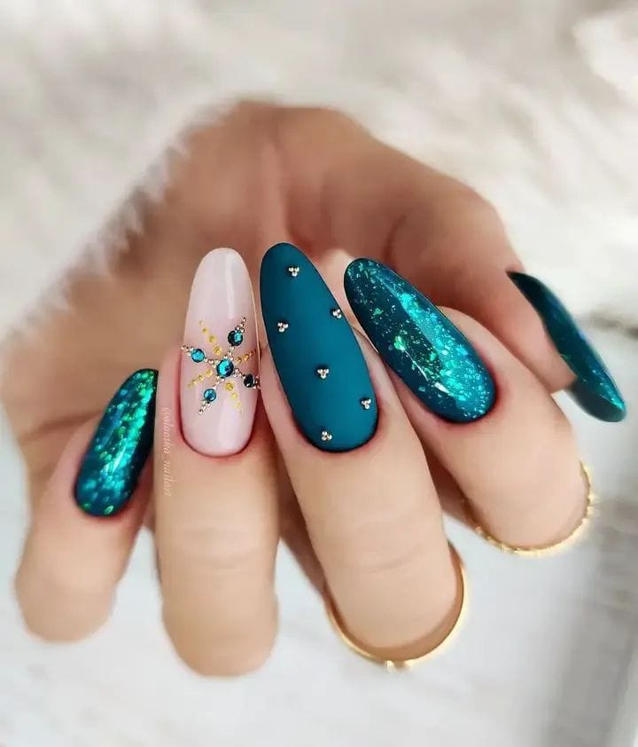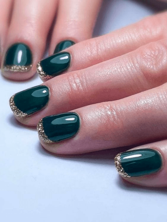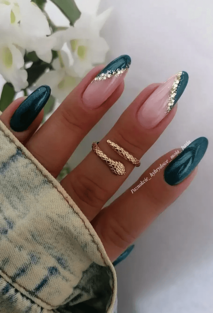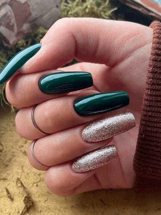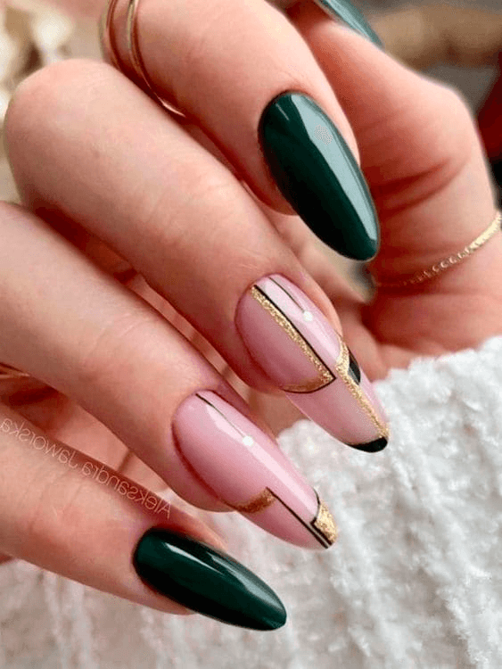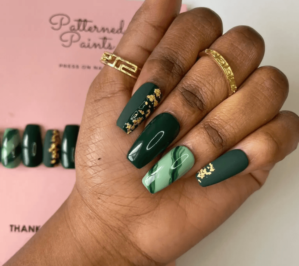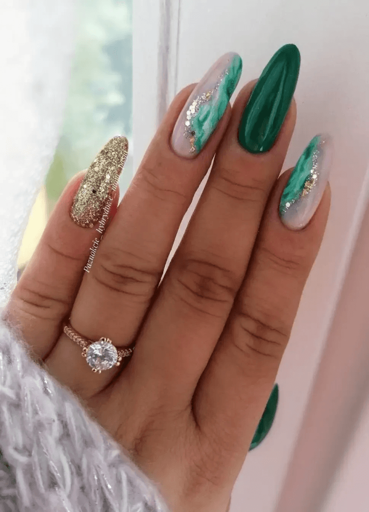 Blend the opulence of emerald green with the glamour of gold! The fusion of these two regal shades creates a harmonious and luxurious combination, exuding elegance and sophistication in every stroke. Whether through intricate nail art or subtle accents, these nails embody a regal and glamorous charm that’s simply captivating.