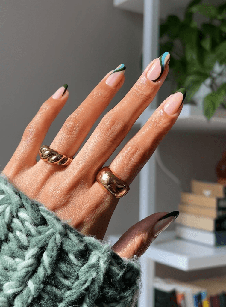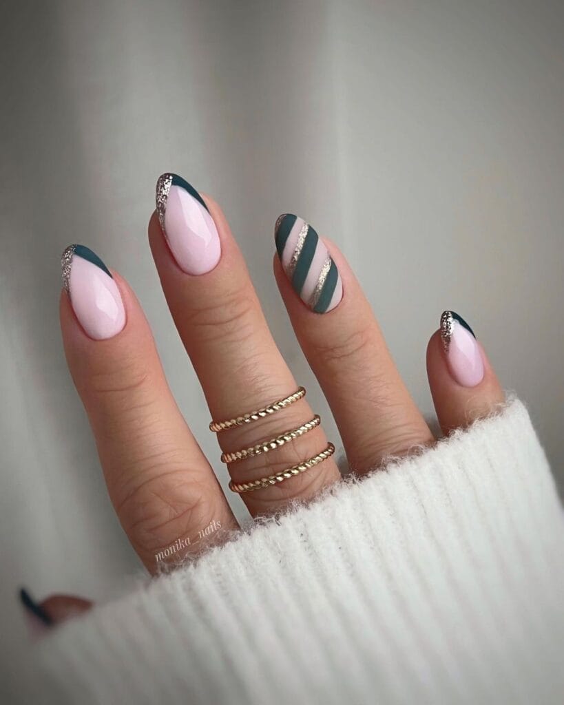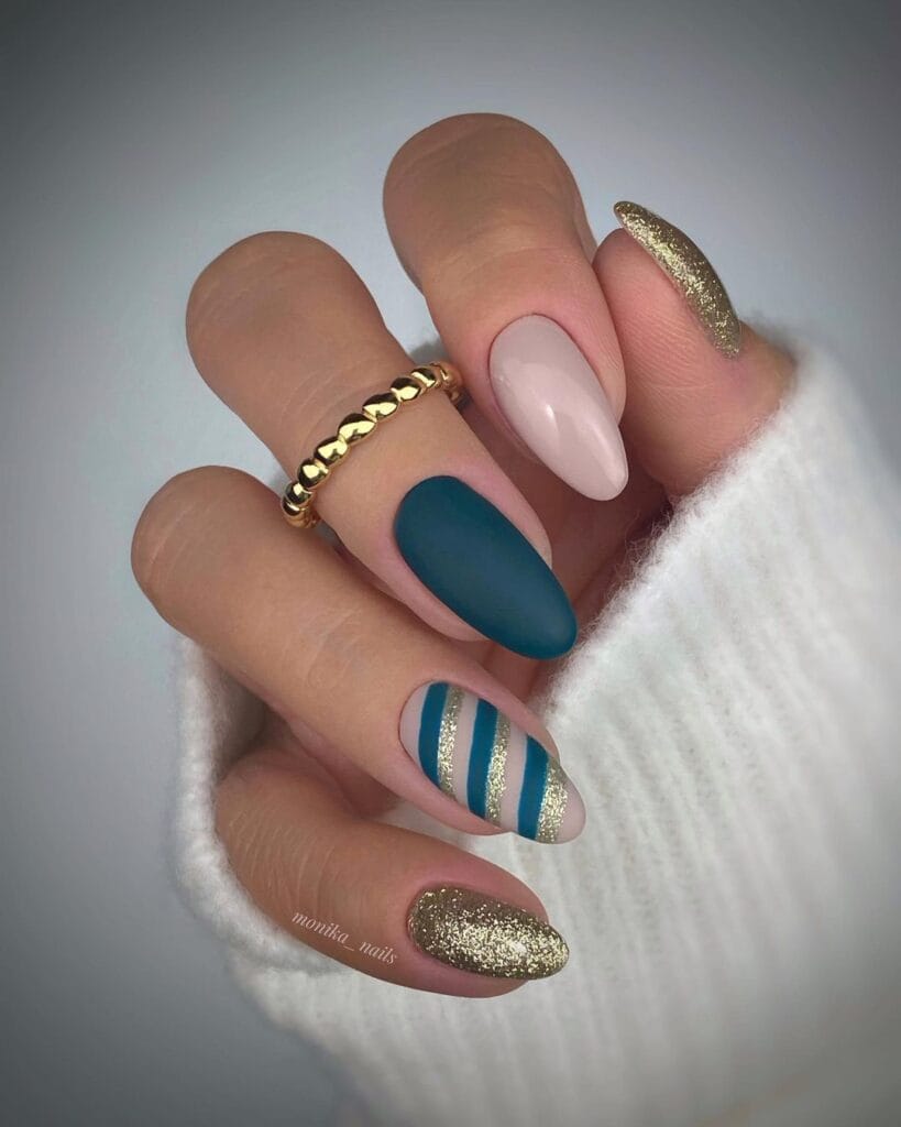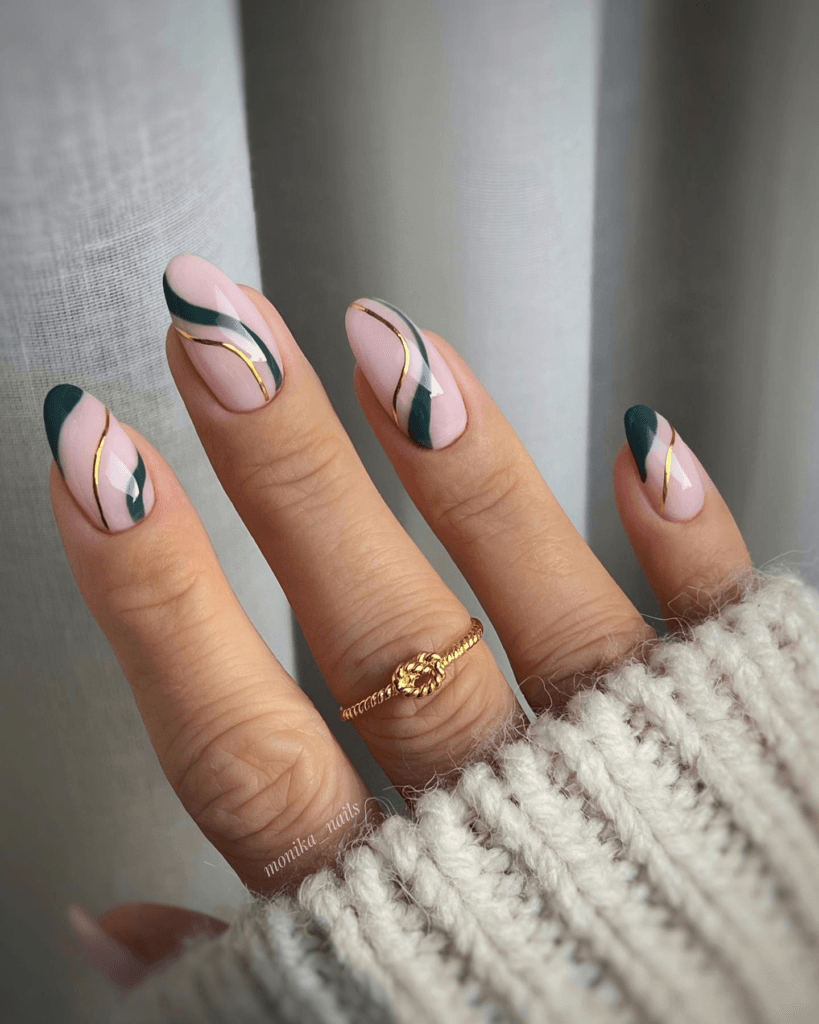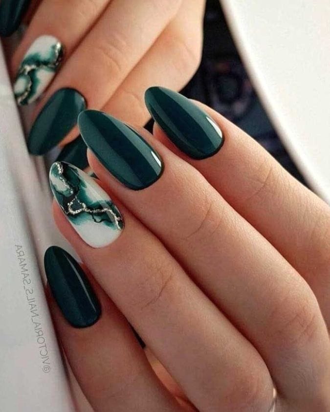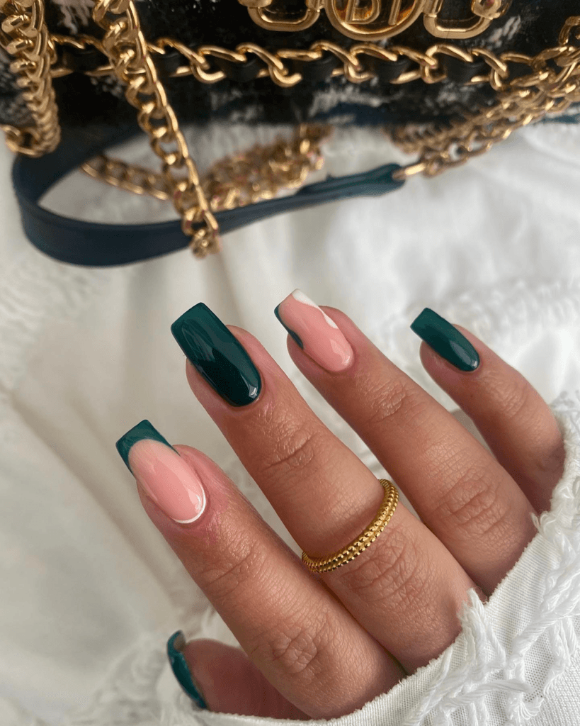 Blend the opulence of emerald green with the glamour of gold! The fusion of these two regal shades creates a harmonious and luxurious combination, exuding elegance and sophistication in every stroke. Whether through intricate nail art or subtle accents, these nails embody a regal and glamorous charm that’s simply captivating.