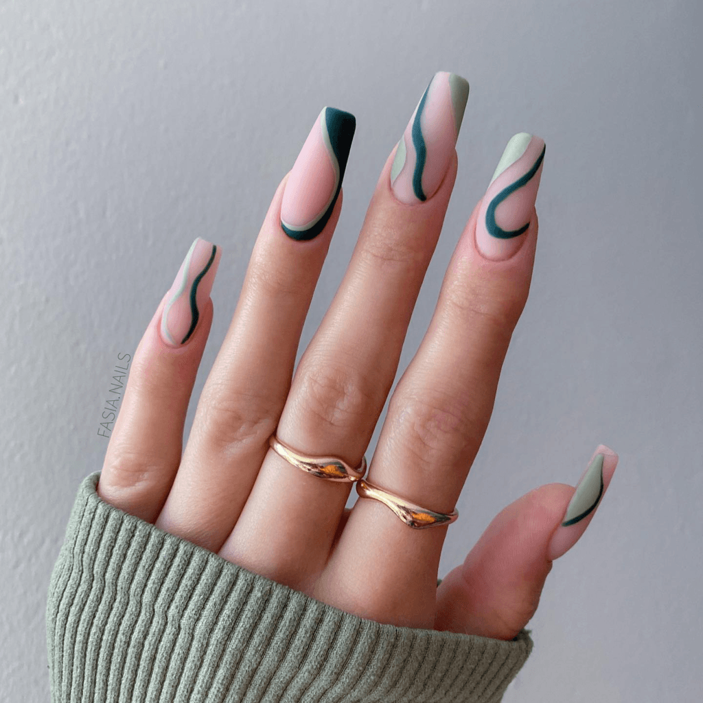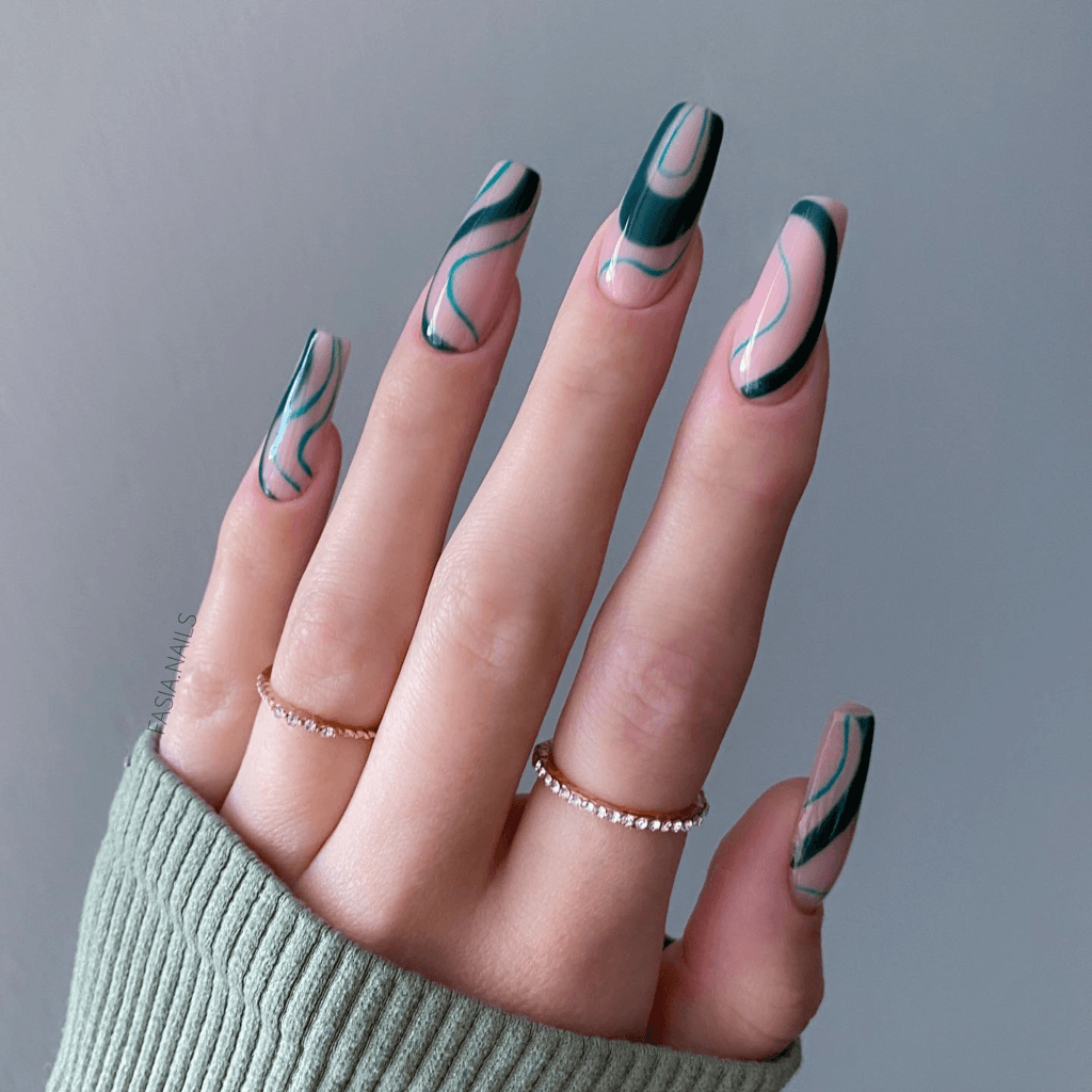 3. Whimsical Whirls: Emerald Nails with Playful Swirls & Twirls