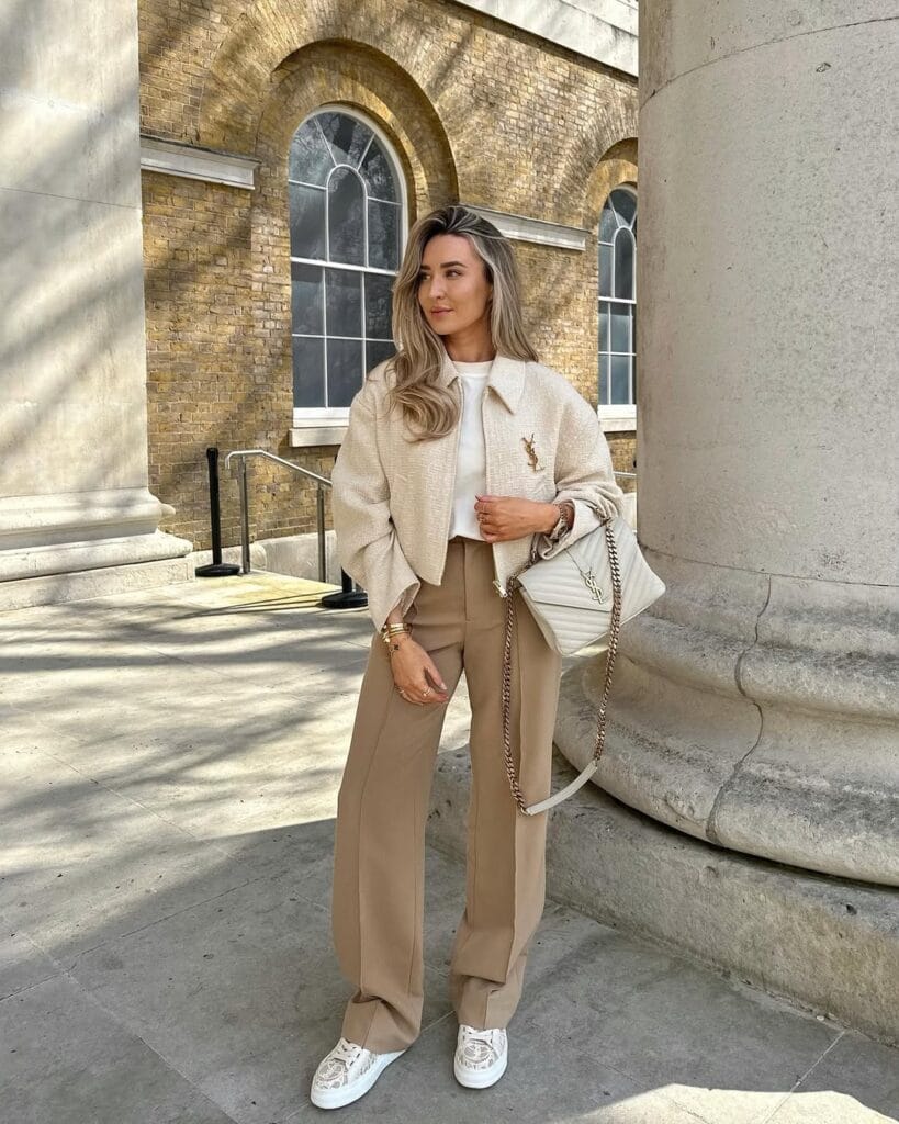 @ freyakillinThis look is equal parts fresh and sophisticated, featuring a creamy textured cropped jacket layered over a white top and paired with high-waist camel trousers. Sleek white sneakers and a quilted shoulder bag finish the outfit for a crisp, casual winter vibe!