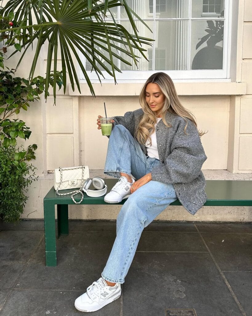 @ fleurraffanThis cozy look pairs a stylish blue denim jacket with loose, elegant white pants and a soft taupe sweater draped over the shouldersāfor the perfect city stroll vibe. She finishes off with a quilted chain bag, black-and-white ballet flats, and a hot coffee in hand for extra winter charm!