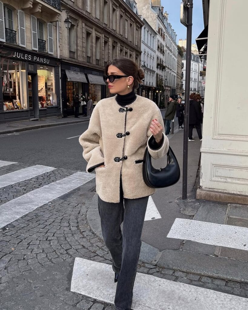 @ heloise.guilletThis street-ready look features a plush taupe toggle coat layered over a sleek black turtleneck and paired with relaxed charcoal jeans. Black pointed-toe boots and a minimalist hobo bag finish the vibe for an effortlessly chic winter stroll!ā