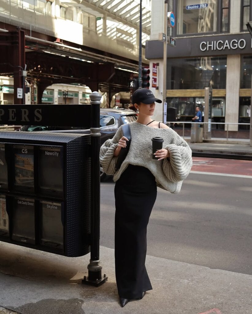 @ stylecadenzaThis outfit features an effortlessly oversized grey knit sweater styled off-the-shoulder and paired with a long, form-fitting black skirt for a chic, cozy contrast. She tops it off with pointed boots, a baseball cap, an on-trend backpack, and coffee for the ultimate laid-back city look!