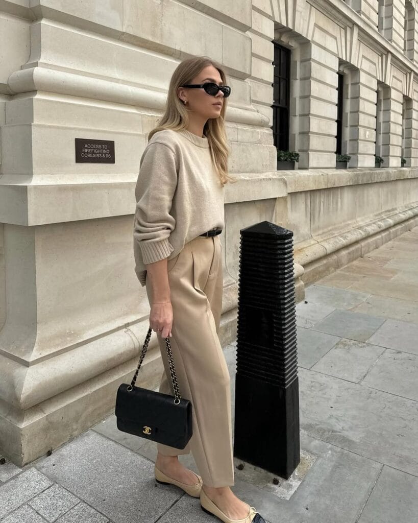 @ mildagudClassic and clean, this look mixes a soft oatmeal knit sweater (perfectly tucked) with tailored high-waisted beige trousers for a timeless vibe. Chic nude and black ballet flats and a quilted black purse finish off the look for understated elegance on any crisp winter street!ā
