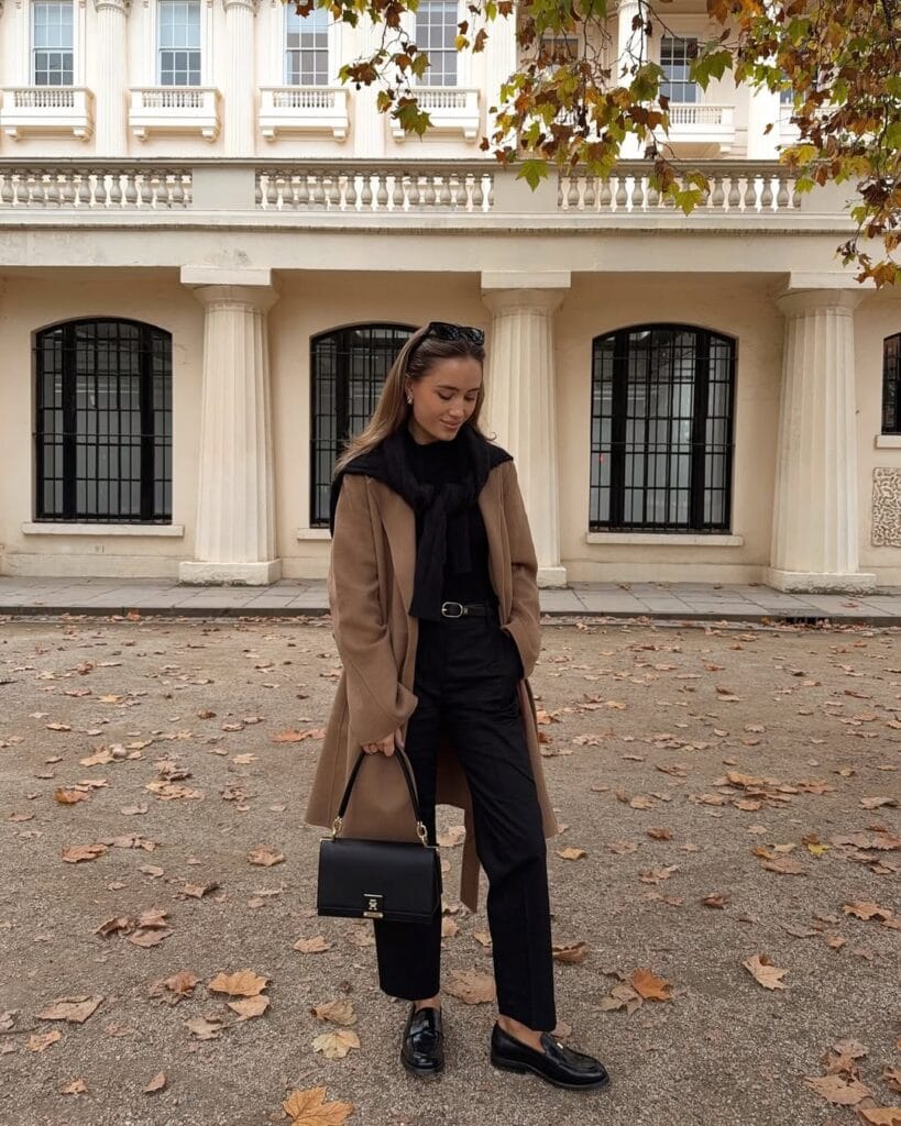 @ kateehutchinsFor ultimate sophistication, this look features a timeless camel coat layered over a black sweater and trousers, with a matching sweater nonchalantly draped around the shoulders. Shiny black loafers and a structured black top-handle bag make it the go-to winter uniform for crisp mornings and city exploring!