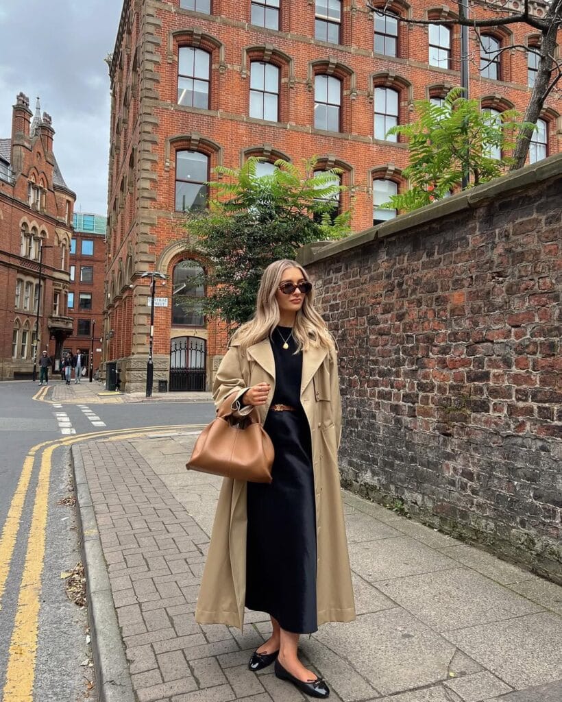 @ lilyisabellaclarkChanneling timeless elegance, this outfit features a khaki trench coat over a black midi dress, belted at the waist for a polished silhouette. Black patent ballet flats and a roomy tan tote complete the lookāperfect for city strolls on crisp winter days!